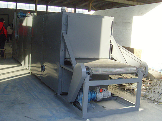 物料由加料器(或手工操作)均勻地鋪在網(wǎng)帶上,網(wǎng)帶一般采用12~16目的不銹鋼絲網(wǎng)(也可根據(jù)物料不同選擇不同的網(wǎng)帶、鋼帶),由轉(zhuǎn)動裝置拖動在干燥機(jī)內(nèi)移動。干燥機(jī)由若干單元組成,每一單元熱風(fēng)可獨(dú)立循環(huán),部分尾氣由專門的排濕風(fēng)機(jī)排出,廢氣排出量由調(diào)節(jié)閥控制。熱氣由下向上穿過鋪滿物料的網(wǎng)帶,完成熱量與質(zhì)量的傳遞,帶走物料水分,從而實(shí)現(xiàn)干燥過程。網(wǎng)帶允許的速度可根據(jù)物料水份及溫度要求調(diào)節(jié),單元數(shù)量也可根據(jù)需要選取。
