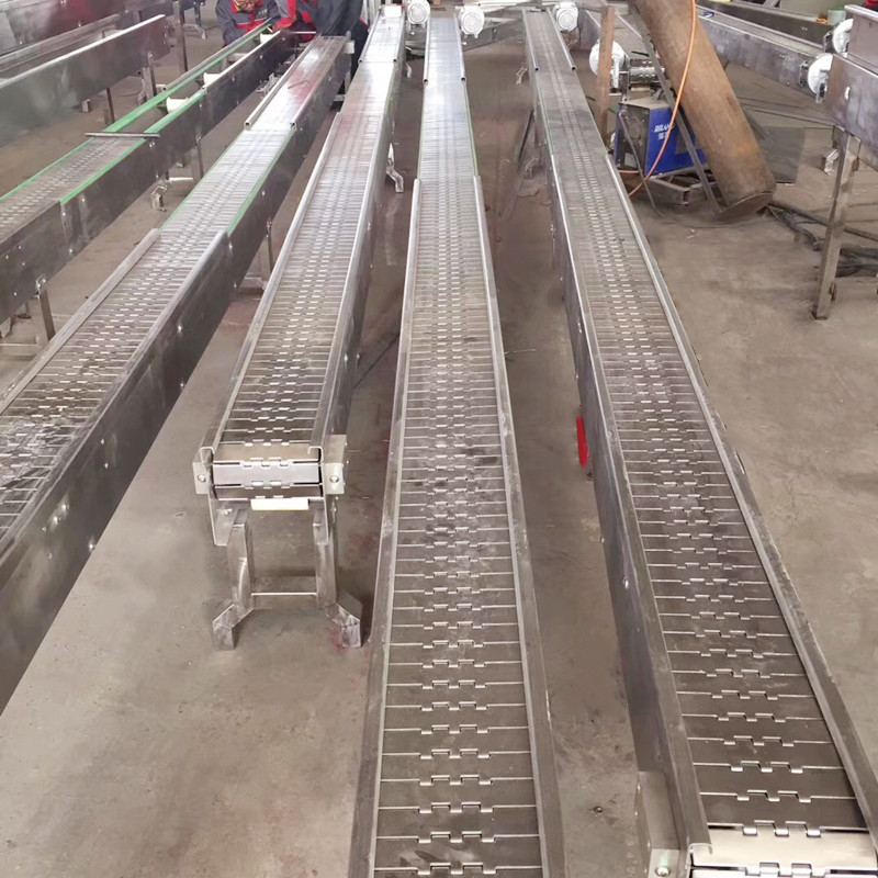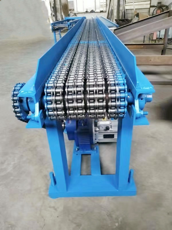 (1)精密滾子鏈條輸送機(jī),采用多排的精密滾子鏈條,抗砸,抗沖擊力,快速,傳送速度快,適合大件,高速的熱鍛造件傳送。鏈條的下面是加厚加重的底板,使用起來放心安心。