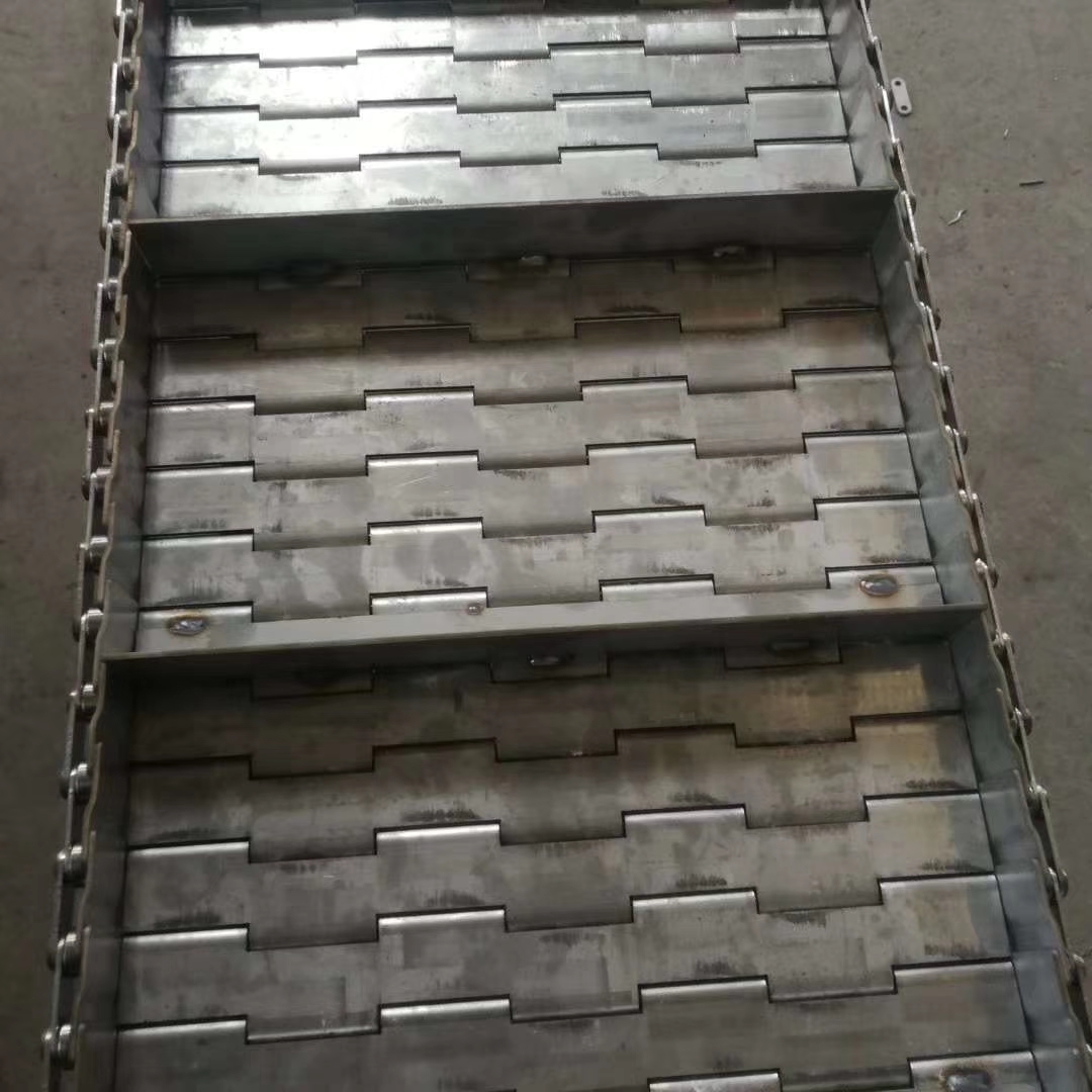 鏈板輸送帶全部是不銹鋼304材質(zhì) 鏈條節(jié)距101.6毫米 鏈條片厚度6毫米 滾子直徑57.15毫米 內(nèi)節(jié)內(nèi)寬31.75毫米 側(cè)擋板有效高度60毫米 板厚3毫米 板厚2毫米下差1.88-1.95毫米 沖孔8毫米 支軸直徑14毫米 兩頭不車 墊圈焊死。