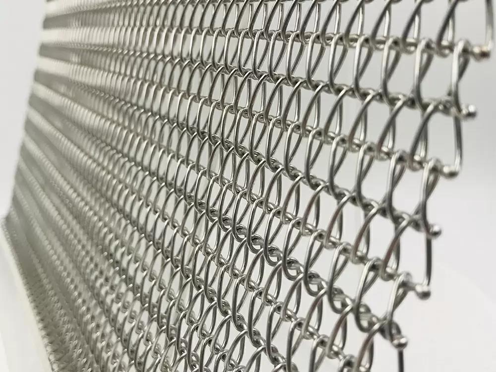 雙旋網(wǎng)是使用曲軸或者直軸把右旋和左旋繞絲串起來形成平衡編織。左旋和右旋可以依據(jù)應用使用圓絲或者扁絲加工生產(chǎn), 雙旋網(wǎng)一般采用摩擦驅(qū)動, 也可以定制齒輪配合網(wǎng)帶驅(qū)動。依據(jù)應用環(huán)境,選擇合適的螺距和節(jié)距,網(wǎng)帶邊緣一般有焊接或者折彎。