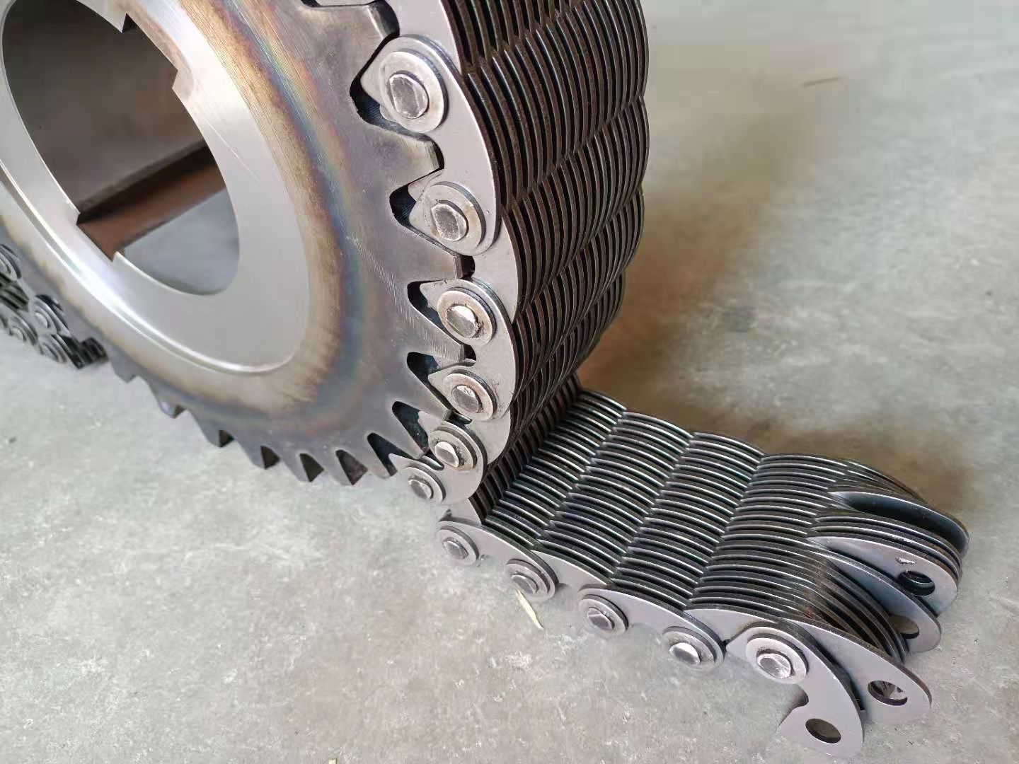 齒形鏈又稱(chēng)無(wú)聲鏈(Silent Chain),屬于傳動(dòng)鏈的一種形式。我國(guó)的國(guó)家標(biāo)準(zhǔn)為:GB/T10855-2003《齒形鏈和鏈輪》。齒形鏈?zhǔn)怯梢幌盗械凝X鏈板和導(dǎo)板交替裝配且銷(xiāo)軸或組合的鉸接元件連接組成,相鄰節(jié)距間為鉸連節(jié)。根據(jù)導(dǎo)向型式可分為:外導(dǎo)式齒形鏈、內(nèi)導(dǎo)式齒形鏈和雙內(nèi)導(dǎo)齒形鏈.齒形鏈又稱(chēng)無(wú)聲鏈,屬于傳動(dòng)鏈的一種形式。齒形鏈?zhǔn)且环N應(yīng)用廣泛的重要機(jī)械基礎(chǔ)件,主要用在高速、重載、低噪音、大中心距的工況下,其傳動(dòng)性能優(yōu)于齒形帶傳動(dòng)、齒輪傳動(dòng)以及磙子鏈傳動(dòng),以成為眾多行業(yè)首選對(duì)傳動(dòng)形式之一,以嚙合形式分可分為內(nèi)嚙合齒形鏈、外嚙合齒形鏈和內(nèi)外復(fù)合嚙合齒形鏈,其中內(nèi)外復(fù)合嚙合齒形鏈的噪音最小,應(yīng)用也最廣泛。
