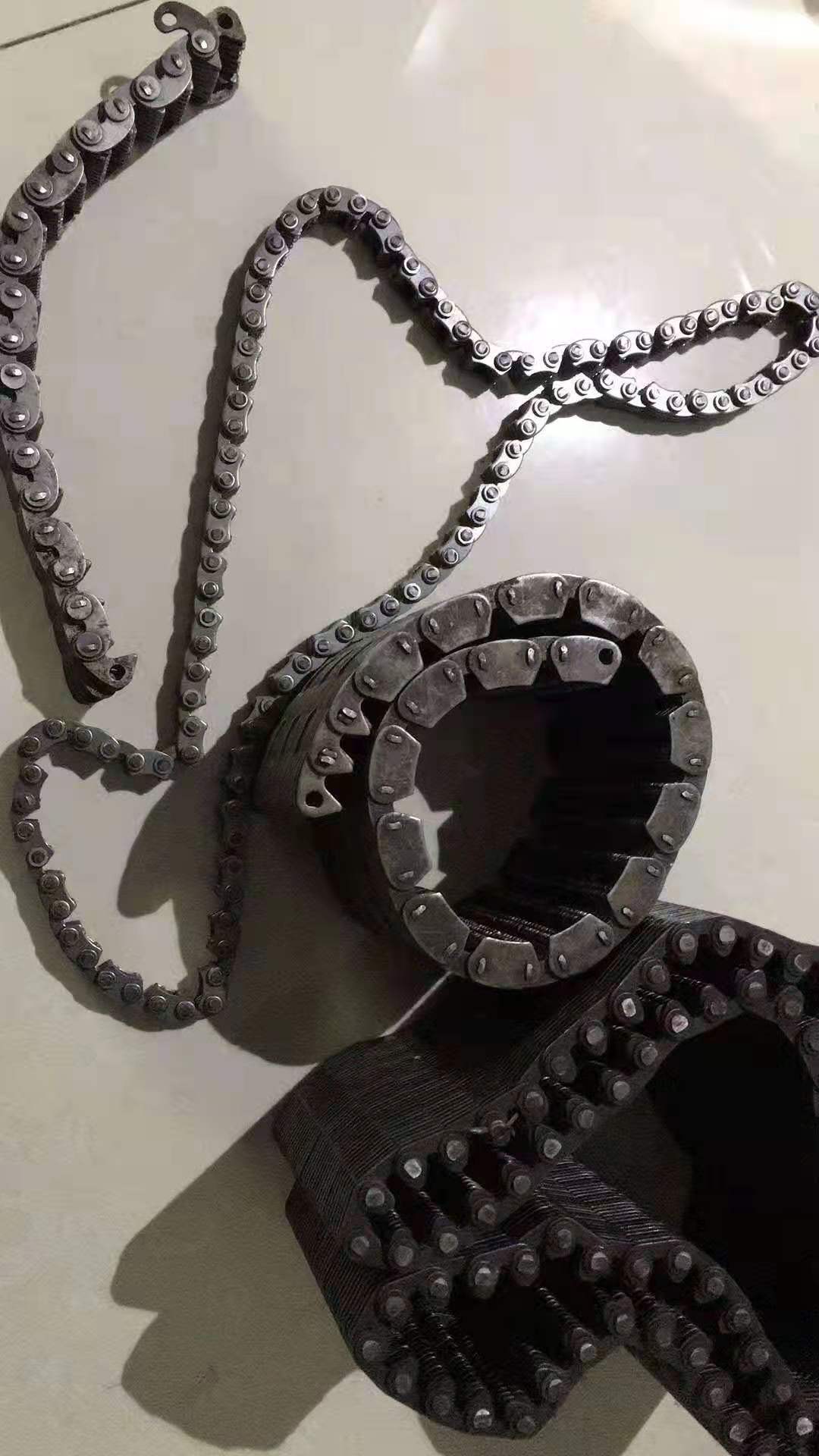 齒形鏈又稱無聲鏈(Silent Chain),屬于傳動鏈的一種形式。我國的國家標準為:GB/T10855-2003《齒形鏈和鏈輪》。齒形鏈是由一系列的齒鏈板和導板交替裝配且銷軸或組合的鉸接元件連接組成,相鄰節(jié)距間為鉸連節(jié)。根據(jù)導向型式可分為:外導式齒形鏈、內(nèi)導式齒形鏈和雙內(nèi)導齒形鏈.齒形鏈又稱無聲鏈,屬于傳動鏈的一種形式。齒形鏈是一種應用廣泛的重要機械基礎件,主要用在高速、重載、低噪音、大中心距的工況下,其傳動性能優(yōu)于齒形帶傳動、齒輪傳動以及磙子鏈傳動,以成為眾多行業(yè)首選對傳動形式之一,以嚙合形式分可分為內(nèi)嚙合齒形鏈、外嚙合齒形鏈和內(nèi)外復合嚙合齒形鏈,其中內(nèi)外復合嚙合齒形鏈的噪音最小,應用也最廣泛。主要特點:1.噪音小 齒形鏈是通過工作鏈板與鏈輪齒的漸開線齒形進行嚙合傳遞動力,與滾子鏈和套筒鏈相比其多邊形效應明顯降低,沖擊小、運動平穩(wěn)、嚙合噪音較小。2.可靠性較高 齒形鏈的鏈節(jié)是多片式結(jié)構(gòu),當其中個別鏈片在工作中遭到破壞時并不影響整根鏈條的工作,使人們能夠及時發(fā)現(xiàn)并更換,如需增加承載能力只需在寬度方向較小尺寸(增加鏈片排數(shù))。3.運動精度高 齒形鏈各鏈節(jié)磨損伸長均勻,可保持較高的運動精度。齒形鏈條主要應用范圍:齒形鏈主要應用在紡織機械和無心磨床,傳送帶機械設備。齒形鏈條的種類:CL06,CL08,CL10,CL12,CL16,CL20。根據(jù)導向分:內(nèi)導的齒形鏈條和外導的齒形鏈條,內(nèi)外復合的齒形鏈條
