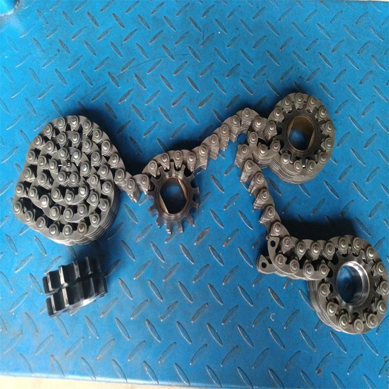 無聲鏈 齒形鏈輪 無聲鏈:也叫齒形鏈條,采用無聲齒形鏈輪帶動運轉傳動。寧津縣榮發(fā)齒輪廠定做各種無聲齒形鏈條,無聲齒形鏈輪。我們根據客戶自己的情況,客戶選型成功,我們根據客戶的數據非標定做各種齒形鏈條和無聲齒形鏈輪。齒形鏈條節(jié)距4.7625,6.35 9.525 12.7 15.875 19.05 25.4 31.75 38.1毫米的鏈條都能做,無聲齒形鏈輪根據客戶的齒數和外徑,內孔,鍵槽定做。無聲齒形鏈條的獨特優(yōu)點:高速,無噪音,高承載傳動能力,轉矩大等等優(yōu)點,逐漸取代精密滾子鏈條和同步帶。