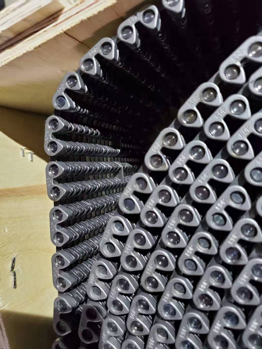 無聲齒形鏈帶:采用鏈條片和銷軸于墊圈做成的輸送用傳送帶,外形寬度非標(biāo)定做也有好多規(guī)格的現(xiàn)貨,鏈帶是用在玻璃廠輸送玻璃瓶罐器皿日用玻璃器皿的,也有的時候用在其他的輸送機(jī)械上,用來輸送其他產(chǎn)品,優(yōu)點(diǎn)就是平整,輸送面平穩(wěn),輸送高腳杯,不會倒瓶,用來輸送高溫玻璃制品,用于玻璃機(jī)械行列式制瓶機(jī)上,橫向輸瓶機(jī),我們還研發(fā)了轉(zhuǎn)彎的拐彎的無聲齒形鏈帶,用于縱向拐彎橫向結(jié)合的輸送機(jī)上。無聲齒形鏈帶材質(zhì)有碳鋼的 錳鋼的 合金鋼的 ,節(jié)距有12.7毫米 25.4毫米 單軸的和雙軸的,無齒形鏈帶從外形看有內(nèi)導(dǎo)向和外導(dǎo)向,有帶保護(hù)帽的和不帶保護(hù)帽的,無聲齒形鏈帶有帶尖的和不帶尖的.