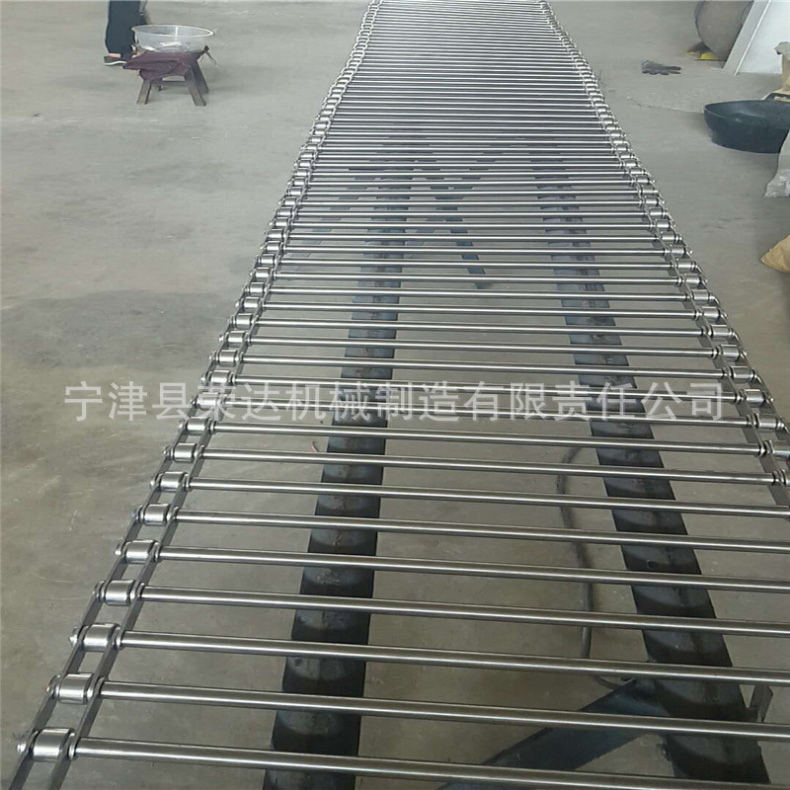 這是一種利用鏈條和支軸做成的傳送輸送帶。先把支軸穿軸的兩頭車細(xì),然后兩邊鑲上鏈條,最后用墊圈把支軸焊上或用開口銷銷上,這就是鏈桿式輸送帶。鏈條的節(jié)距和材質(zhì)和滾子的大小各種都有,支軸的粗細(xì)和材質(zhì)和直徑和長(zhǎng)度有多種型號(hào)供選擇。