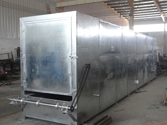 物料由加料器(或手工操作)均勻地鋪在網(wǎng)帶上,網(wǎng)帶一般采用12~16目的不銹鋼絲網(wǎng)(也可根據(jù)物料不同選擇不同的網(wǎng)帶、鋼帶),由轉(zhuǎn)動(dòng)裝置拖動(dòng)在干燥機(jī)內(nèi)移動(dòng)。干燥機(jī)由若干單元組成,每一單元熱風(fēng)可獨(dú)立循環(huán),部分尾氣由專門的排濕風(fēng)機(jī)排出,廢氣排出量由調(diào)節(jié)閥控制。熱氣由下向上穿過鋪滿物料的網(wǎng)帶,完成熱量與質(zhì)量的傳遞,帶走物料水分,從而實(shí)現(xiàn)干燥過程。網(wǎng)帶允許的速度可根據(jù)物料水份及溫度要求調(diào)節(jié),單元數(shù)量也可根據(jù)需要選取。