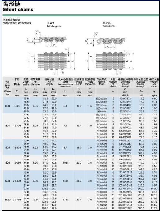 CL08-CL20齒形鏈條,sc3-sc10無(wú)聲鏈條:無(wú)聲鏈條,一種傳動(dòng)鏈條。齒形鏈條是一種無(wú)音鏈條,傳動(dòng)精度高,齒形鏈條無(wú)噪音,齒形鏈條傳動(dòng)速度高,齒形鏈條節(jié)距從9.525毫米到31.75毫米,齒形鏈條腰部弧形,跟直行的SC4齒形鏈條不一樣。