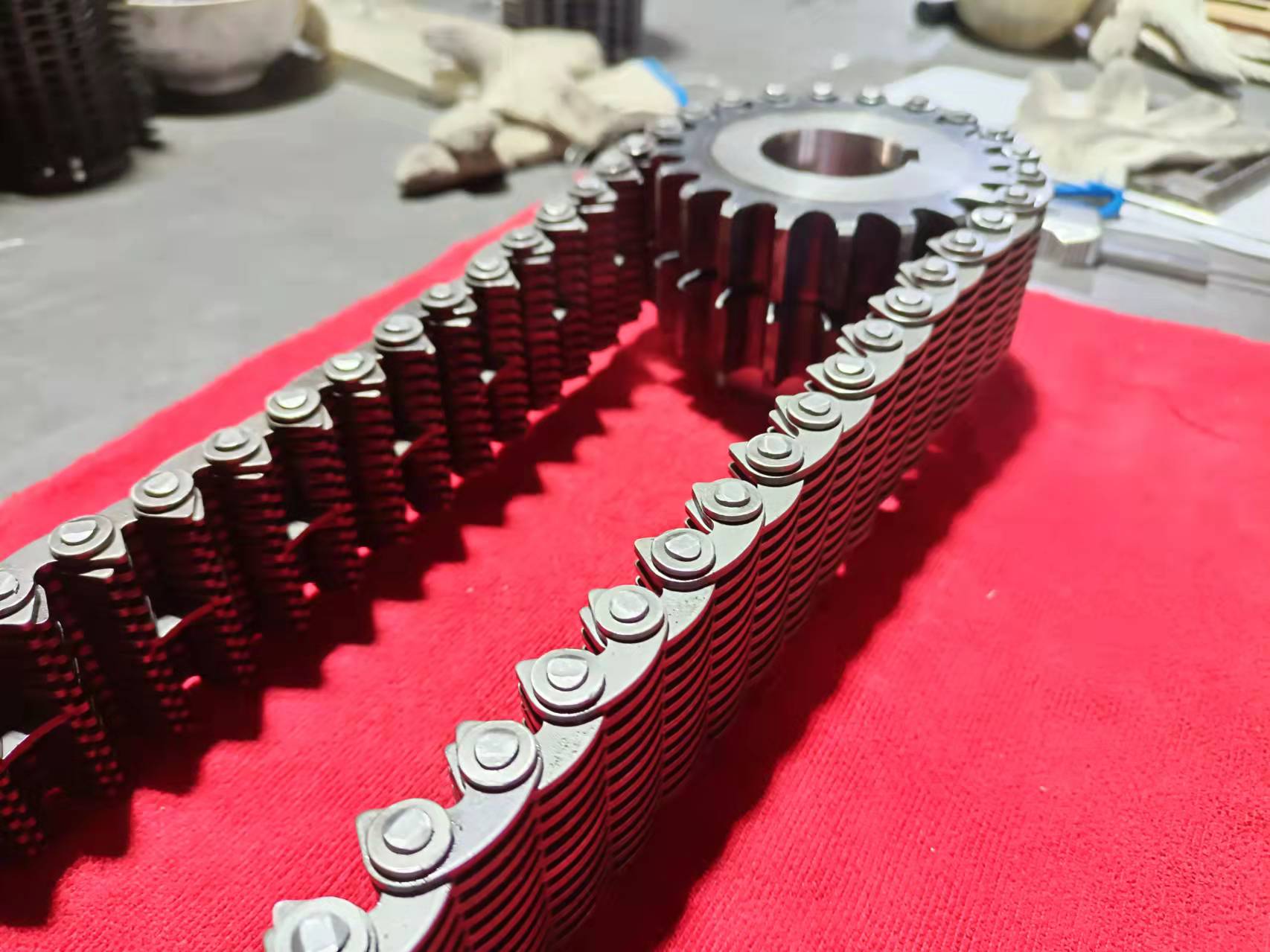 無聲齒形鏈條生產(chǎn)廠家  無聲齒形鏈帶輪:一種傳動(dòng)配件,通過帶動(dòng)無聲齒形鏈帶,來輸送玻璃瓶罐,陶瓷玻璃制品,無聲齒形鏈帶輪是一種圓柱形外齒齒輪,直齒的無聲齒形鏈帶,分內(nèi)導(dǎo)和外導(dǎo),是玻璃行列機(jī)輸瓶機(jī)上用的一種傳動(dòng)配件,無聲齒形鏈帶輪材質(zhì)45#鋼,40CR,耐高溫耐磨都經(jīng)過淬火熱處理,內(nèi)孔鍵槽根據(jù)客戶要求定做,有125毫米 150毫米 200毫米 300毫米,厚度根據(jù)客戶要定做,節(jié)距有12.7毫米,25.4毫米。無聲齒形鏈帶輪可以發(fā)黑處理,做防銹處理,做減輕孔