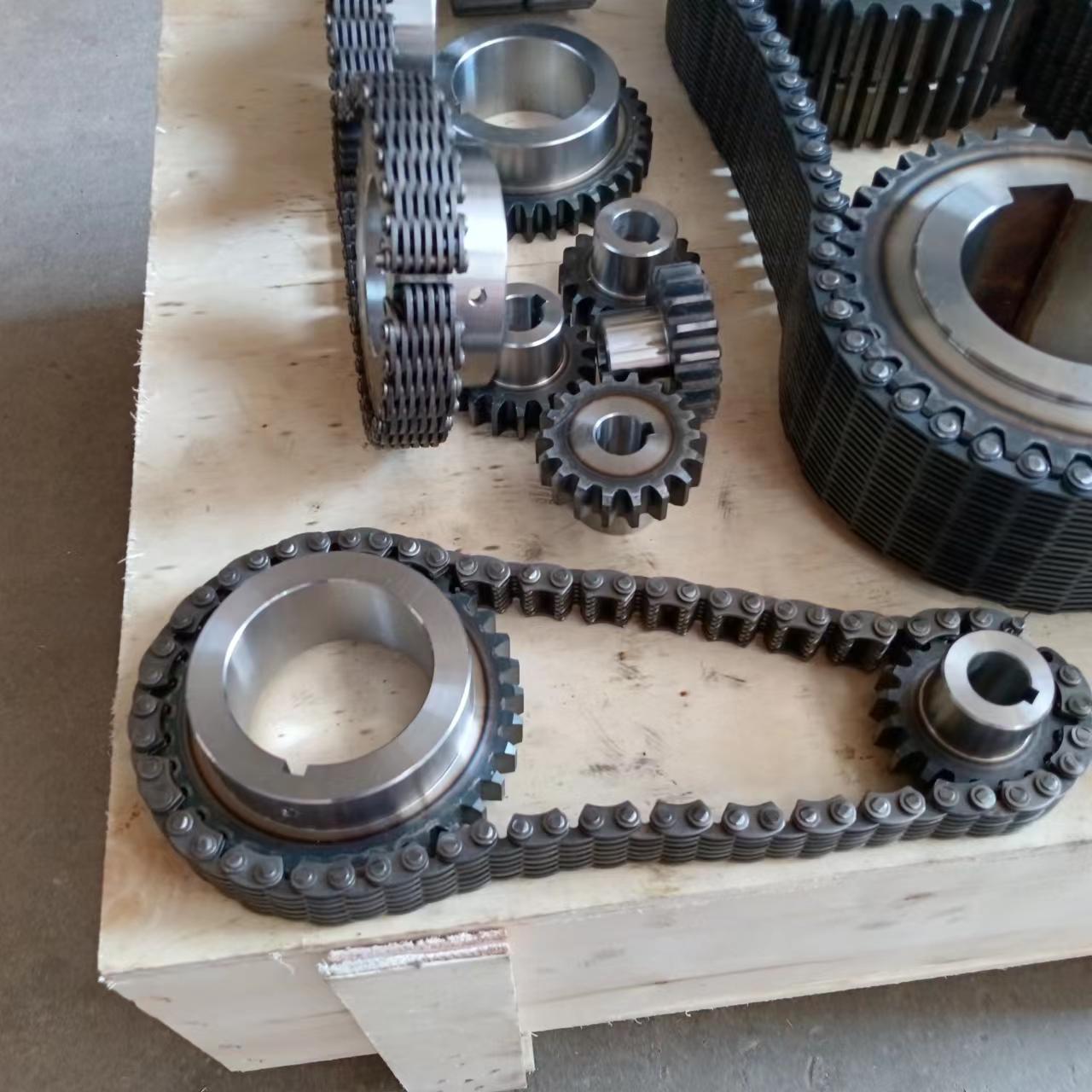 無聲鏈 齒形鏈輪  無聲鏈:也叫齒形鏈條,采用無聲齒形鏈輪帶動(dòng)運(yùn)轉(zhuǎn)傳動(dòng)。寧津縣榮發(fā)齒輪廠定做各種無聲齒形鏈條,無聲齒形鏈輪。我們根據(jù)客戶自己的情況,客戶選型成功,我們根據(jù)客戶的數(shù)據(jù)非標(biāo)定做各種齒形鏈條和無聲齒形鏈輪。齒形鏈條節(jié)距4.7625,6.35  9.525  12.7  15.875  19.05  25.4  31.75  38.1毫米的鏈條都能做,無聲齒形鏈輪根據(jù)客戶的齒數(shù)和外徑,內(nèi)孔,鍵槽定做。無聲齒形鏈條的獨(dú)特優(yōu)點(diǎn):高速,無噪音,高承載傳動(dòng)能力,轉(zhuǎn)矩大等等優(yōu)點(diǎn),逐漸取代精密滾子鏈條和同步帶。