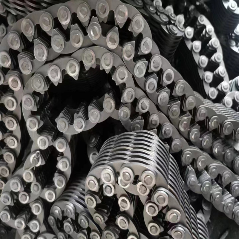 齒形鏈又稱無聲鏈(Silent Chain),屬于傳動鏈的一種形式。我國的國家標準為:GB/T10855-2003《齒形鏈和鏈輪》。齒形鏈是由一系列的齒鏈板和導板交替裝配且銷軸或組合的鉸接元件連接組成,相鄰節(jié)距間為鉸連節(jié)。根據(jù)導向型式可分為:外導式齒形鏈、內(nèi)導式齒形鏈和雙內(nèi)導齒形鏈.齒形鏈又稱無聲鏈,屬于傳動鏈的一種形式。齒形鏈是一種應用廣泛的重要機械基礎件,主要用在高速、重載、低噪音、大中心距的工況下,其傳動性能優(yōu)于齒形帶傳動、齒輪傳動以及磙子鏈傳動,以成為眾多行業(yè)對傳動形式之一,以嚙合形式分可分為內(nèi)嚙合齒形鏈、外嚙合齒形鏈和內(nèi)外復合嚙合齒形鏈,其中內(nèi)外復合嚙合齒形鏈的噪音小,應用也廣泛。主要特點:1.噪音小 齒形鏈是通過工作鏈板與鏈輪齒的漸開線齒形進行嚙合傳遞動力,與滾子鏈和套筒鏈相比其多邊形效應明顯降低,沖擊小、運動平穩(wěn)、嚙合噪音較小。2.可靠性較高 齒形鏈的鏈節(jié)是多片式結構,當其中個別鏈片在工作中遭到破壞時并不影響整根鏈條的工作,使人們能夠及時發(fā)現(xiàn)并更換,如需增加承載能力只需在寬度方向較小尺寸(增加鏈片排數(shù))。3.運動精度高 齒形鏈各鏈節(jié)磨損伸長均勻,可保持較高的運動精度。齒形鏈條主要應用范圍:齒形鏈主要應用在紡織機械和無心磨床,傳送帶機械設備。齒形鏈條的種類:CL06,CL08,CL10,CL12,CL16,CL20。根據(jù)導向分:內(nèi)導的齒形鏈條和外導的齒形鏈條,內(nèi)外復合的齒形鏈條