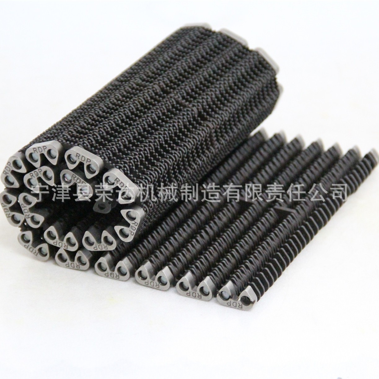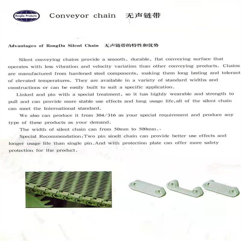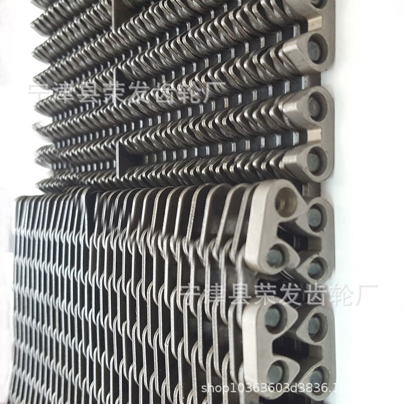 無聲齒形鏈帶:采用鏈條片和銷軸于墊圈做成的輸送用傳送帶,外形寬度非標(biāo)定做也有好多規(guī)格的現(xiàn)貨,鏈帶是用在玻璃廠輸送玻璃瓶罐器皿日用玻璃器皿的,也有的時候用在其他的輸送機(jī)械上,用來輸送其他產(chǎn)品,優(yōu)點(diǎn)就是平整,輸送面平穩(wěn),輸送高腳杯,不會倒瓶,用來輸送高溫玻璃制品,用于玻璃機(jī)械行列式制瓶機(jī)上,橫向輸瓶機(jī),我們還研發(fā)了轉(zhuǎn)彎的拐彎的無聲齒形鏈帶,用于縱向拐彎橫向結(jié)合的輸送機(jī)上。無聲齒形鏈帶材質(zhì)有碳鋼的 錳鋼的 合金鋼的 ,節(jié)距有12.7毫米 25.4毫米 單軸的和雙軸的,無齒形鏈帶從外形看有內(nèi)導(dǎo)向和外導(dǎo)向,有帶保護(hù)帽的和不帶保護(hù)帽的,無聲齒形鏈帶有帶尖的和不帶尖的.